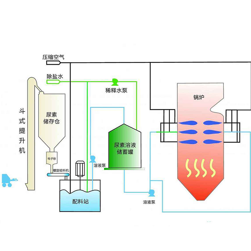 SNCR技術是將一定質量的尿素溶液溶液通過霧化噴射系統直接噴入爐窯合適溫度區域(850~950℃),霧化后的氨與 NOX(NO、NO2 等混合物)進行選擇性非催化還原反應,將NOX轉化成無污染的N2。其工藝流程如下圖所示: